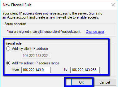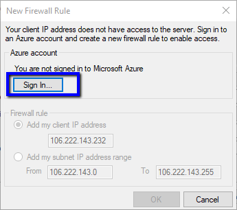 However, in SSMS v17.0, we have the ability to do that setting on click of Connect above. A new pop up will be shown to create the firewall rule where we need click on Sign In to login with the Azure credential.