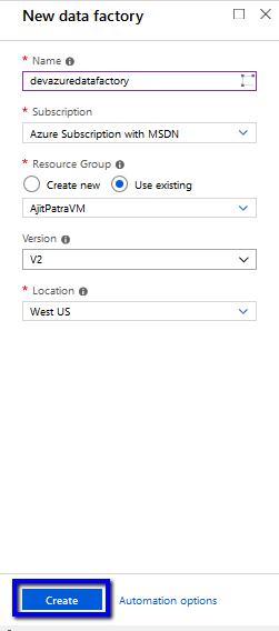 Give a unique name to the data factory, fill the mandatory fields. Select Version as V2 as we are going to work with SSIS package which has been introduced with ADF V2. Click on Create