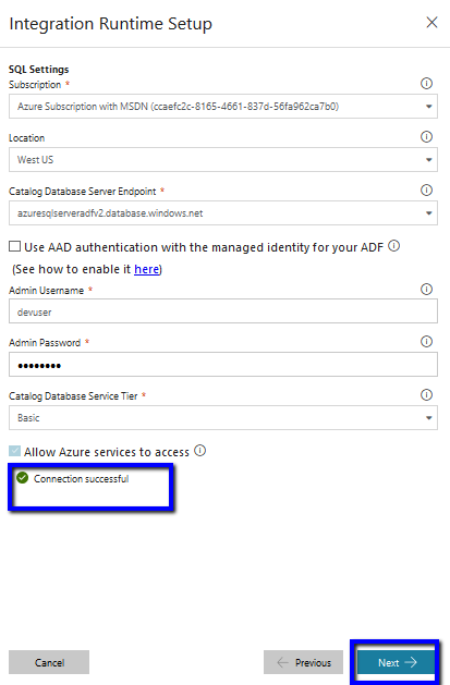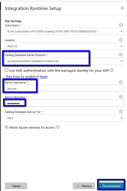 Select the Azure SQL Server that we have created above. Fill the credential to login to the SQL server and click Test Connection.