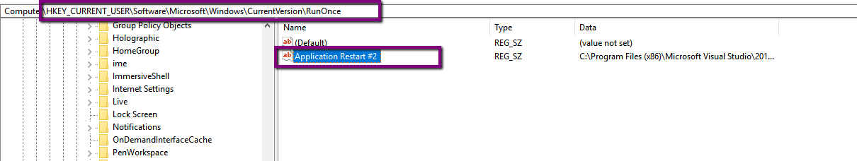 “HKCU\Software\Microsoft\Windows\CurrentVersion\RunOnce” and found Application Restart #2 key value pair as shown: