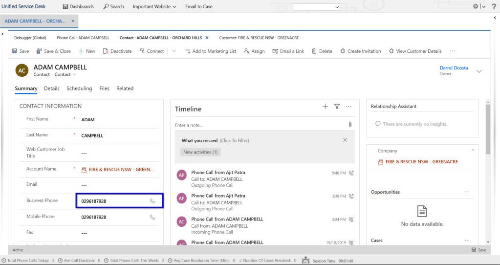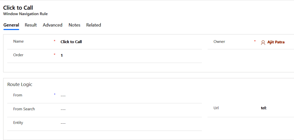 Clicking on Phone icon on the Business Phone field triggered the Windows Navigation Rule(configured on Step 1) as shown below: