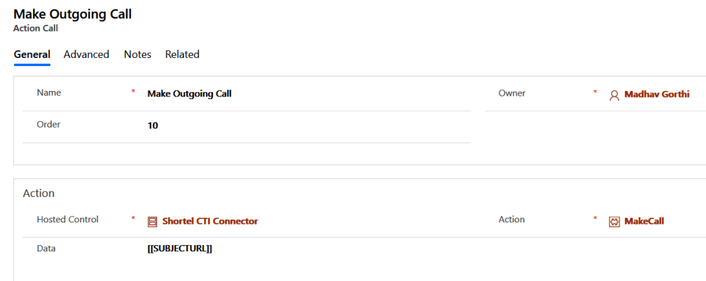 Step 3: Create an Action Call for the UII action we created in Step 2 as shown below. We have passed data parameter [[SUBJECTURL]] as this is the parameter which holds the phone number. This will fire MakeCall action which we’ll override to inject our custom code to make outgoing call.