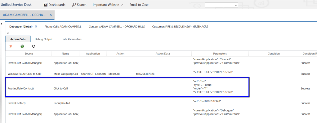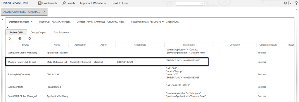 The Windows Navigation Rule fires the action call(configured on step 4) as shown below, which in turn fires MakeCall action that we have overridden in Step 5 to make outgoing call.