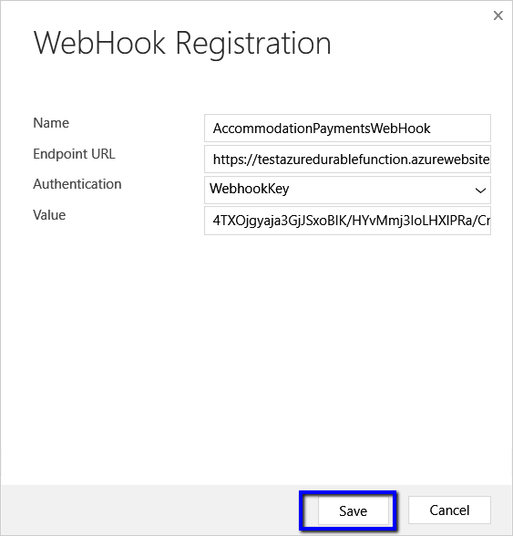 For the Azure Durable Function URL: https://testazuredurablefunction.azurewebsites.net/api/AccommodationPayments?code=4TXOjgyaja3GjJSxoBIK/HYvMmj3IoLHXlPRa/Cn6e0S16aBQjyHZg== , below are the details we need to put to register the webhook.