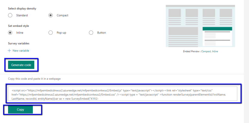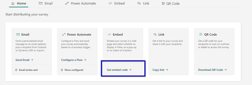 Since, we’re going to embed the survey on a form, click on Get embed code.