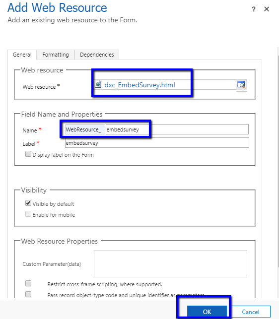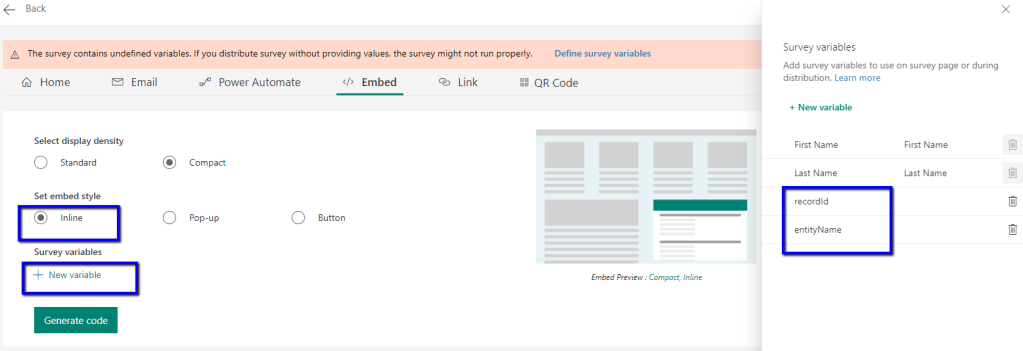 Here, we can pass additional information/parameters to survey using variables. We are using recordId and entityName as additional variables. Select Inline as the embed style.