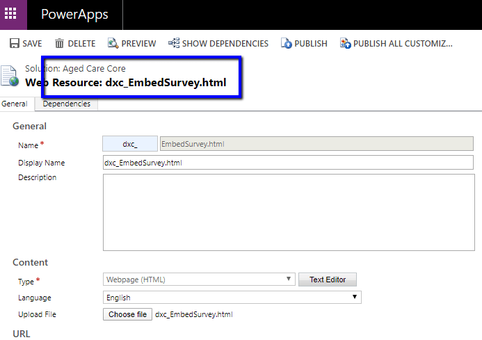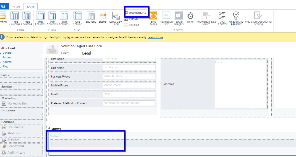 Let’s add a new tab and then a new section to Lead form. Click on Insert Web Resource.