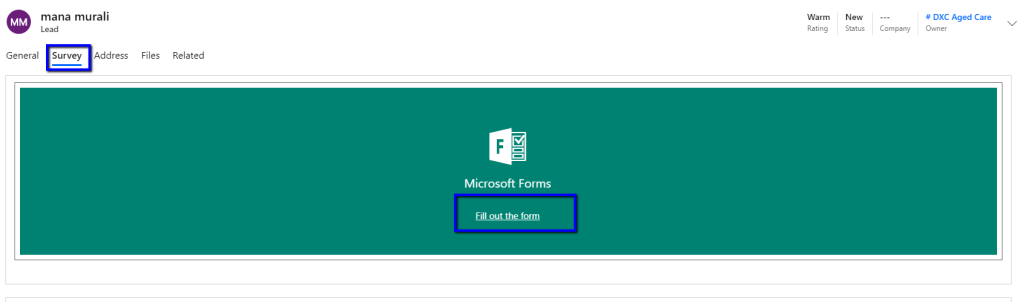 Open any Lead record and navigate to Survey tab. We’ll see the survey embedded. Click on Fill out the form to open the survey.
