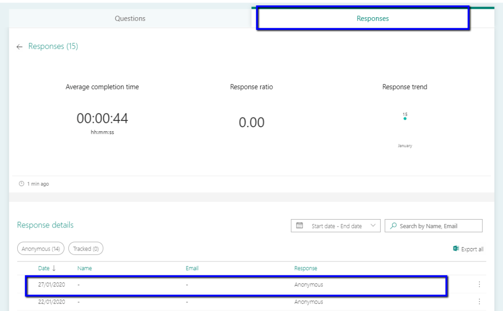 The response will be recorded. We can go to the survey then click on Responses tab to see the submitted responses.