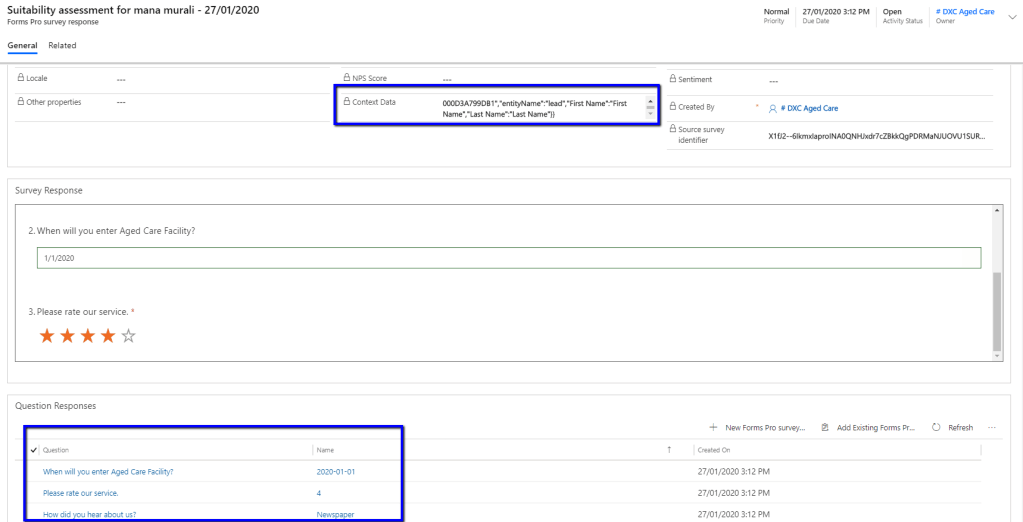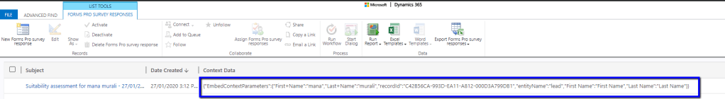 We can use recordId and entityName values in Context Data field to populate Regarding field. To achieve this, we wrote a post-create plugin on Forms Pro Survey Response, parsed the value of Context Data field and populated Regarding lookup field using record ID and entity Name.