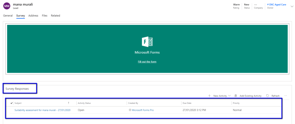 Finally, we inserted that Activity view created, on Lead form to see the related survey responses of the corresponding Lead record.